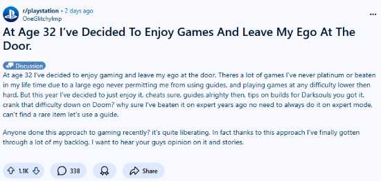 针对这类方式,一位玩家日前在Reddit论坛发帖给出了自己的观点。这位玩家称:“在我32岁的时候,我决定要好好享受游戏,因为我此前自尊心太强,有很多游戏我从来都不看攻略,也从不选择低于困难模式的难度去游玩,所以我未拿到过白金奖杯或者通关。”