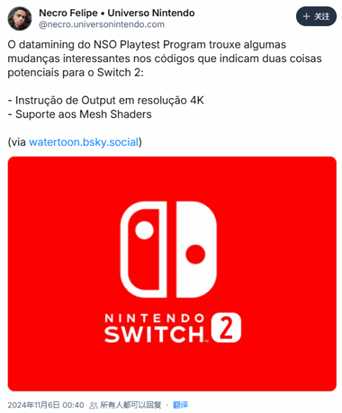 据外媒mynintendonews报道,在社交媒体平台Bluesky里,一位名叫“Watertoon”的数据挖掘者发文表示,通过通过挖掘任天堂Switch Online Playtest的代码,发现NS继任机型或支持4K分辨率以及网格着色器。